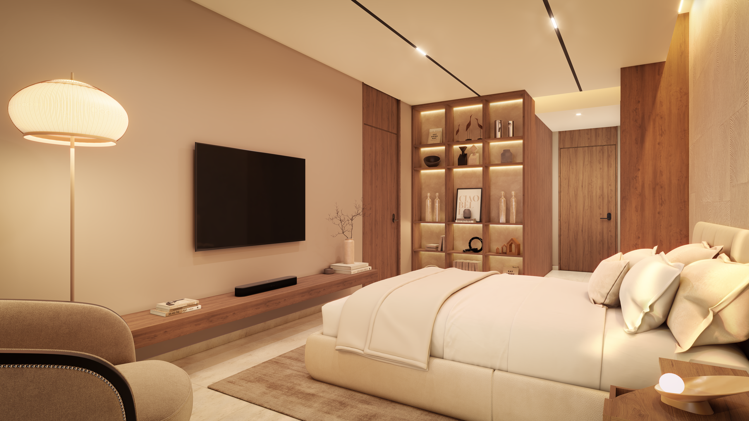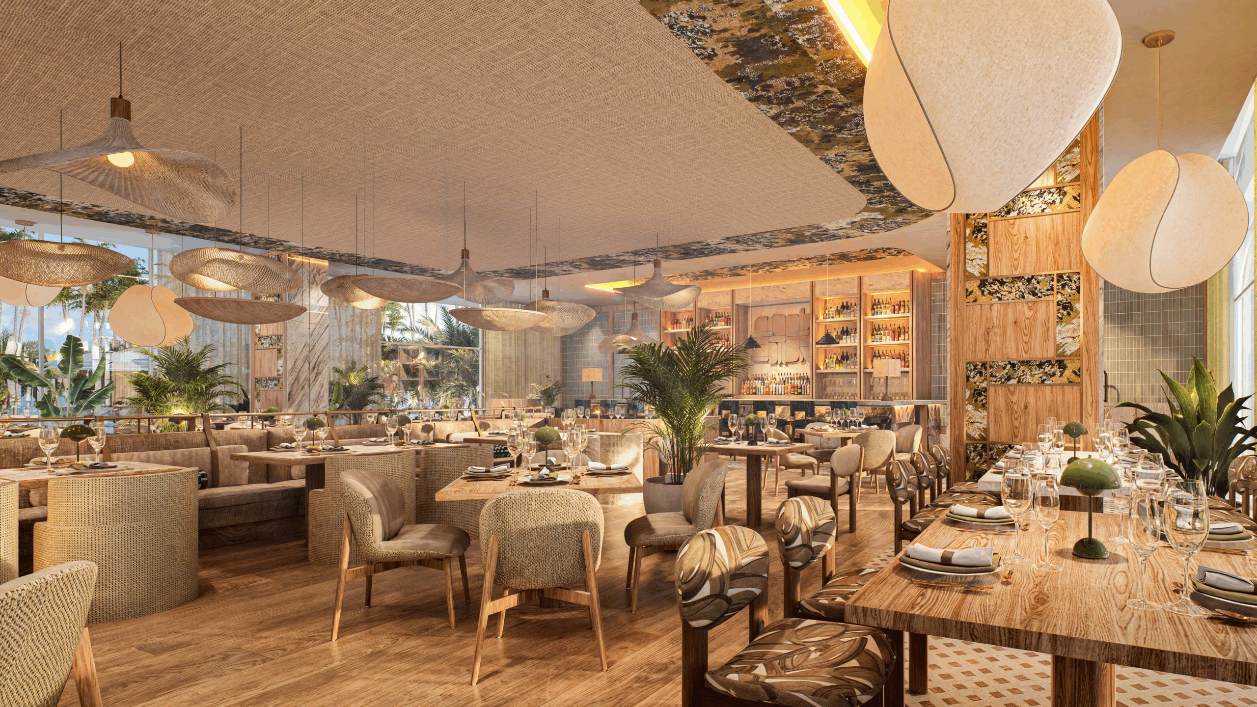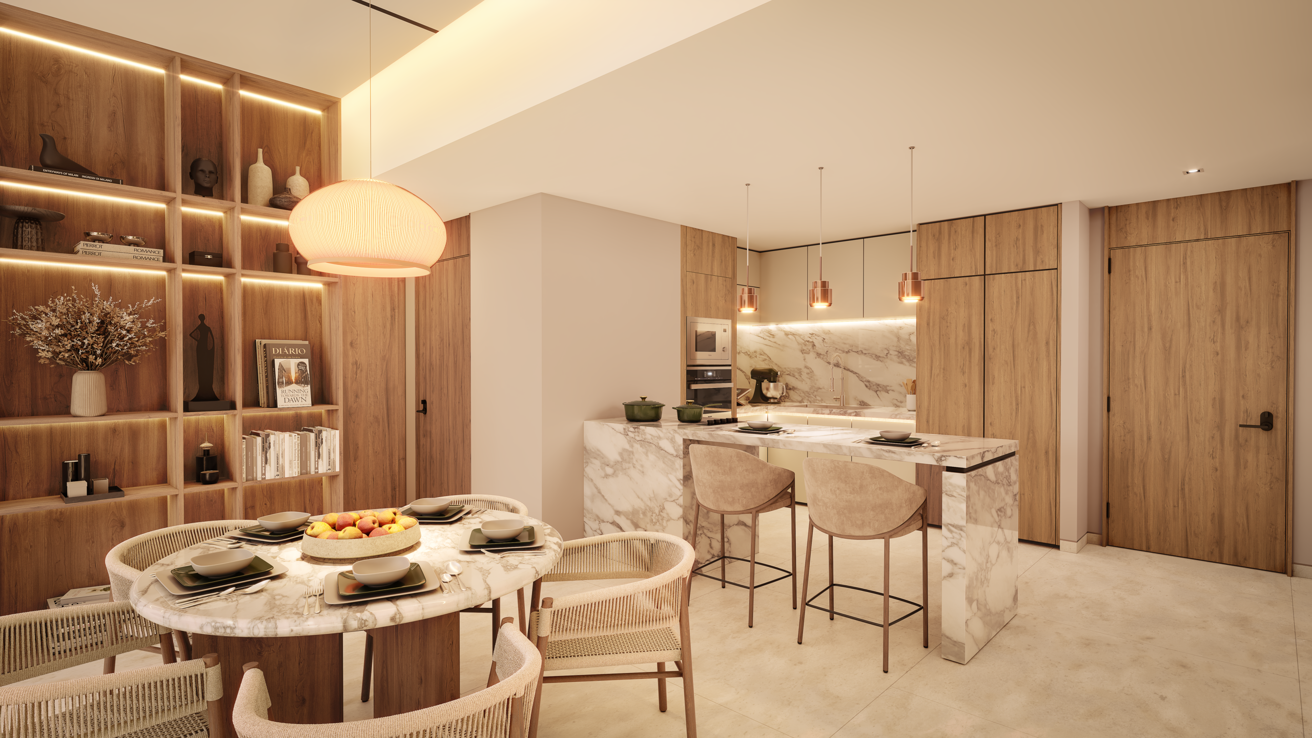 Diseño interior con superficies de piedra natural y porcelánicos de gran formato.