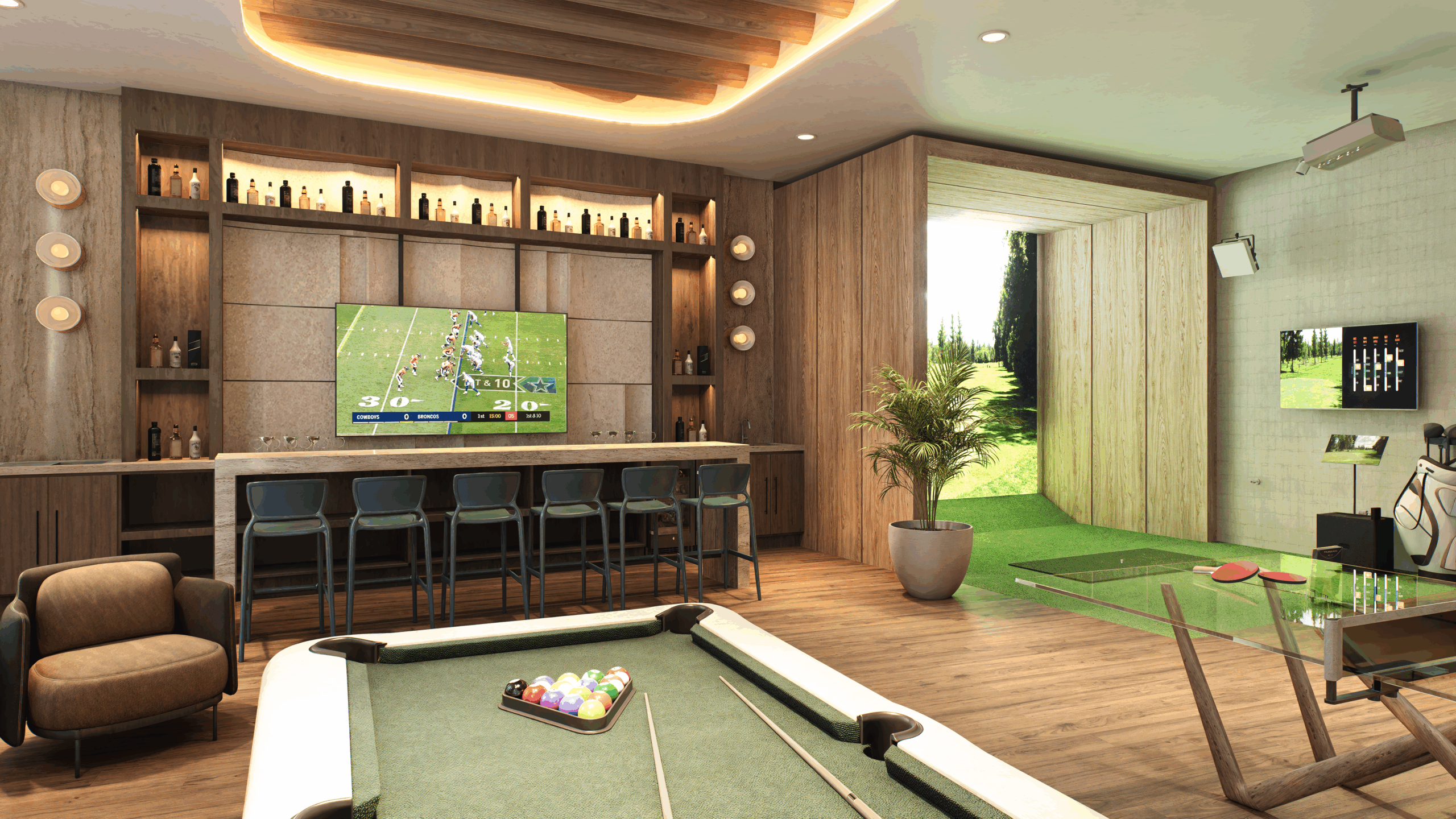 Salón de juegos: simuladores de golf y F1, PlayStation, billar, ping-pong, dardos, cinema